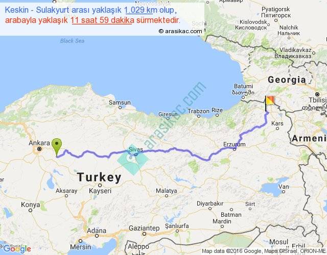 Keskin - Sulakyurt arası yaklaşık olarak 90 km/h ile yukarıda belirtilen sürede olup, iki yerin kuş uçuşu uzaklığı (mesafesi) 775'dir. Eğer belirtilen yerler arasında uçak seferi var ise bu süre uçakla 1 saat 11 dakika'ya kadar düşebilir. Yolculuk otobüsle 15 saat 34 dakika sürmektedir.