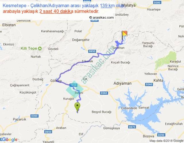 Kesmetepe - Çelikhan Adıyaman arası yaklaşık olarak 90 km/h ile yukarıda belirtilen sürede olup, iki yerin kuş uçuşu uzaklığı (mesafesi) 72'dir. Yolculuk otobüsle 3 saat 28 dakika sürmektedir.