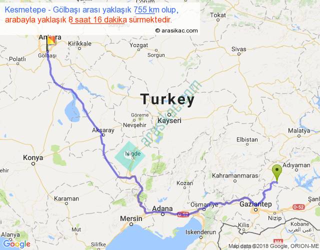 Kesmetepe - Gölbaşı arası yaklaşık olarak 90 km/h ile yukarıda belirtilen sürede olup, iki yerin kuş uçuşu uzaklığı (mesafesi) 501'dir. Eğer belirtilen yerler arasında uçak seferi var ise bu süre uçakla 46 dakika'ya kadar düşebilir. Yolculuk otobüsle 10 saat 44 dakika sürmektedir.