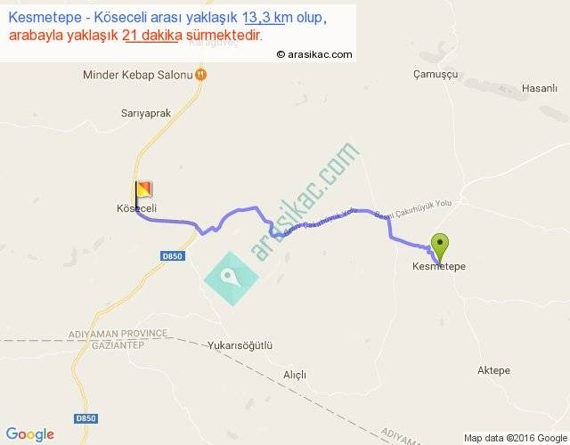Kesmetepe - Köseceli arası yaklaşık olarak 90 km/h ile yukarıda belirtilen sürede olup, iki yerin kuş uçuşu uzaklığı (mesafesi) 10'dir. Yolculuk otobüsle 27 dakika sürmektedir.