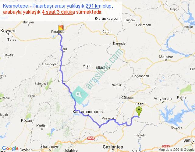 Kesmetepe - Pınarbaşı arası yaklaşık olarak 90 km/h ile yukarıda belirtilen sürede olup, iki yerin kuş uçuşu uzaklığı (mesafesi) 181'dir. Yolculuk otobüsle 5 saat 15 dakika sürmektedir.