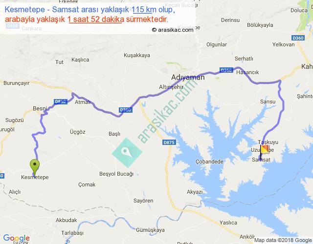 Kesmetepe - Samsat arası yaklaşık olarak 90 km/h ile yukarıda belirtilen sürede olup, iki yerin kuş uçuşu uzaklığı (mesafesi) 56'dir. Yolculuk otobüsle 2 saat 25 dakika sürmektedir.