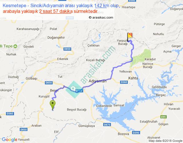 Kesmetepe - Sincik Adıyaman arası yaklaşık olarak 90 km/h ile yukarıda belirtilen sürede olup, iki yerin kuş uçuşu uzaklığı (mesafesi) 85'dir. Yolculuk otobüsle 3 saat 50 dakika sürmektedir.
