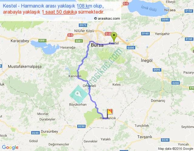 Kestel - Harmancık arası yaklaşık olarak 90 km/h ile yukarıda belirtilen sürede olup, iki yerin kuş uçuşu uzaklığı (mesafesi) 58'dir. Yolculuk otobüsle 2 saat 23 dakika sürmektedir.