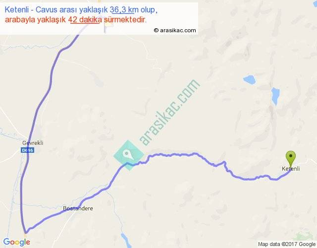 Ketenli - Cavus arası yaklaşık olarak 90 km/h ile yukarıda belirtilen sürede olup, iki yerin kuş uçuşu uzaklığı (mesafesi) 14'dir. Yolculuk otobüsle 54 dakika sürmektedir.