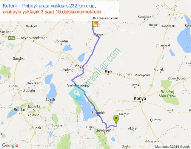 Ketenli - Piribeyli arası yaklaşık olarak 90 km/h ile yukarıda belirtilen sürede olup, iki yerin kuş uçuşu uzaklığı (mesafesi) 158'dir. Yolculuk otobüsle 4 saat 7 dakika sürmektedir.