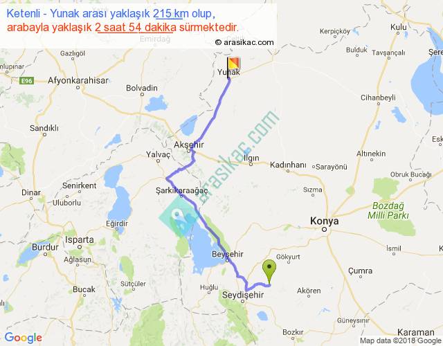 Ketenli - Yunak arası yaklaşık olarak 90 km/h ile yukarıda belirtilen sürede olup, iki yerin kuş uçuşu uzaklığı (mesafesi) 145'dir. Yolculuk otobüsle 3 saat 46 dakika sürmektedir.