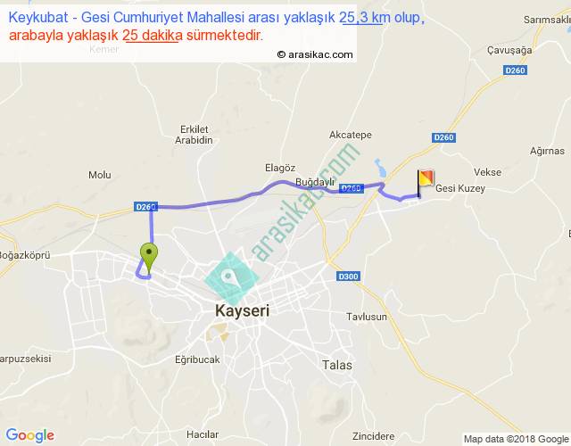 Keykubat - Gesi Cumhuriyet Mahallesi arası yaklaşık olarak 90 km/h ile yukarıda belirtilen sürede olup, iki yerin kuş uçuşu uzaklığı (mesafesi) 19'dir. Yolculuk otobüsle 32 dakika sürmektedir.