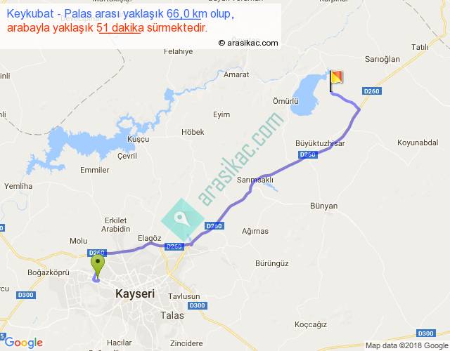 Keykubat - Palas arası yaklaşık olarak 90 km/h ile yukarıda belirtilen sürede olup, iki yerin kuş uçuşu uzaklığı (mesafesi) 50'dir. Yolculuk otobüsle 1 saat 6 dakika sürmektedir.