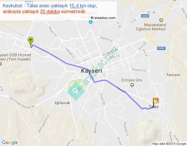 Keykubat - Talas arası yaklaşık olarak 90 km/h ile yukarıda belirtilen sürede olup, iki yerin kuş uçuşu uzaklığı (mesafesi) 14'dir. Yolculuk otobüsle 32 dakika sürmektedir.