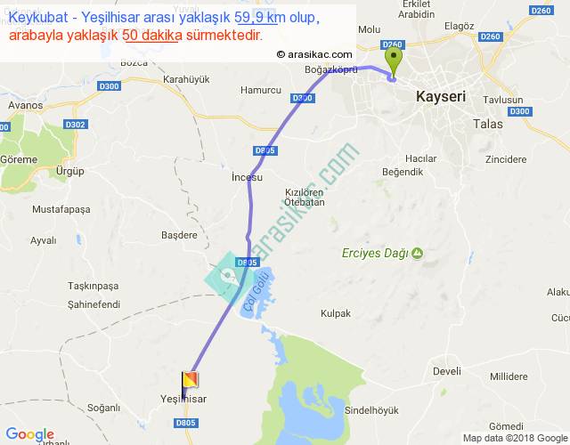 Keykubat - Yeşilhisar arası yaklaşık olarak 90 km/h ile yukarıda belirtilen sürede olup, iki yerin kuş uçuşu uzaklığı (mesafesi) 51'dir. Yolculuk otobüsle 1 saat 5 dakika sürmektedir.
