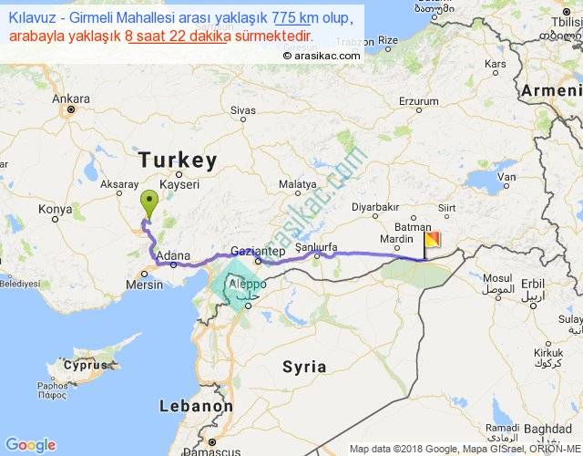 Kılavuz - Girmeli Mahallesi arası yaklaşık olarak 90 km/h ile yukarıda belirtilen sürede olup, iki yerin kuş uçuşu uzaklığı (mesafesi) 589'dir. Eğer belirtilen yerler arasında uçak seferi var ise bu süre uçakla 54 dakika'ya kadar düşebilir. Yolculuk otobüsle 10 saat 52 dakika sürmektedir.