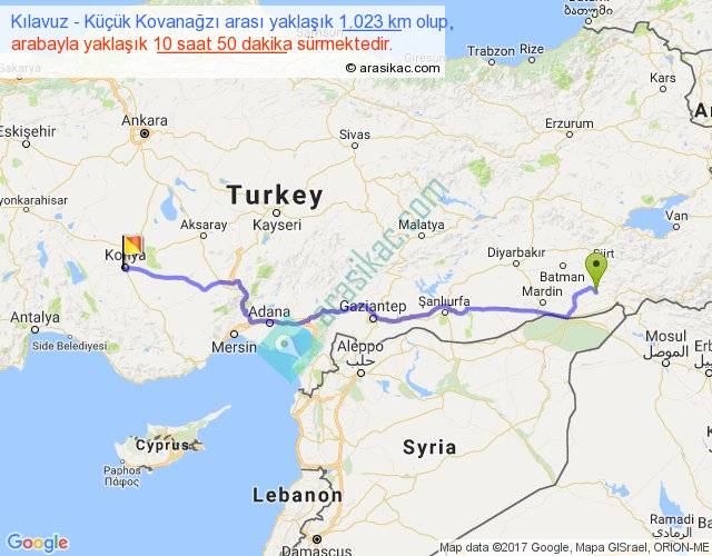Kılavuz - Küçük Kovanağzı arası yaklaşık olarak 90 km/h ile yukarıda belirtilen sürede olup, iki yerin kuş uçuşu uzaklığı (mesafesi) 816'dir. Eğer belirtilen yerler arasında uçak seferi var ise bu süre uçakla 1 saat 15 dakika'ya kadar düşebilir. Yolculuk otobüsle 14 saat 5 dakika sürmektedir.