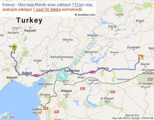 Kılavuz - Mazıdağı Mardin arası yaklaşık olarak 90 km/h ile yukarıda belirtilen sürede olup, iki yerin kuş uçuşu uzaklığı (mesafesi) 499'dir. Eğer belirtilen yerler arasında uçak seferi var ise bu süre uçakla 46 dakika'ya kadar düşebilir. Yolculuk otobüsle 9 saat 45 dakika sürmektedir.