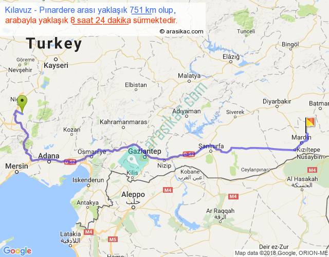 Kılavuz - Pınardere arası yaklaşık olarak 90 km/h ile yukarıda belirtilen sürede olup, iki yerin kuş uçuşu uzaklığı (mesafesi) 532'dir. Eğer belirtilen yerler arasında uçak seferi var ise bu süre uçakla 49 dakika'ya kadar düşebilir. Yolculuk otobüsle 10 saat 55 dakika sürmektedir.