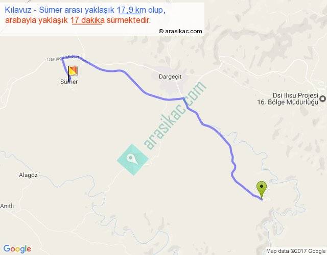 Kılavuz - Sümer arası yaklaşık olarak 90 km/h ile yukarıda belirtilen sürede olup, iki yerin kuş uçuşu uzaklığı (mesafesi) 13'dir. Yolculuk otobüsle 22 dakika sürmektedir.