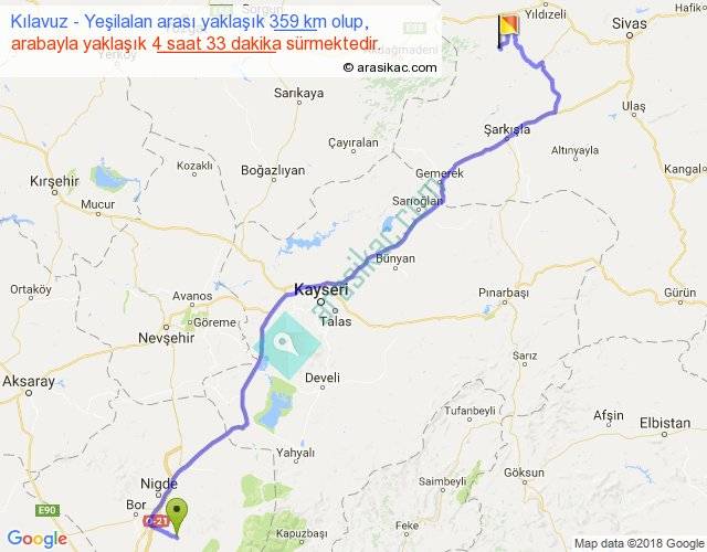 Kılavuz - Yeşilalan arası yaklaşık olarak 90 km/h ile yukarıda belirtilen sürede olup, iki yerin kuş uçuşu uzaklığı (mesafesi) 251'dir. Eğer belirtilen yerler arasında uçak seferi var ise bu süre uçakla 23 dakika'ya kadar düşebilir. Yolculuk otobüsle 5 saat 54 dakika sürmektedir.
