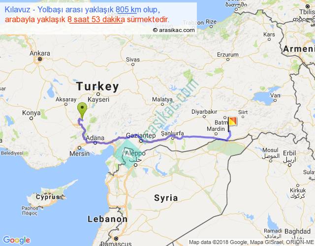 Kılavuz - Yolbaşı arası yaklaşık olarak 90 km/h ile yukarıda belirtilen sürede olup, iki yerin kuş uçuşu uzaklığı (mesafesi) 576'dir. Eğer belirtilen yerler arasında uçak seferi var ise bu süre uçakla 53 dakika'ya kadar düşebilir. Yolculuk otobüsle 11 saat 32 dakika sürmektedir.