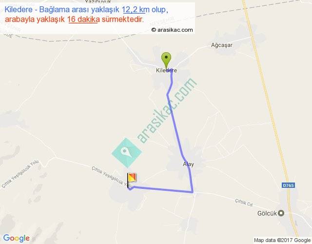 Kiledere - Bağlama arası yaklaşık olarak 90 km/h ile yukarıda belirtilen sürede olup, iki yerin kuş uçuşu uzaklığı (mesafesi) 8'dir. Yolculuk otobüsle 20 dakika sürmektedir.