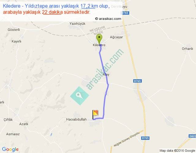 Kiledere - Yıldıztepe arası yaklaşık olarak 90 km/h ile yukarıda belirtilen sürede olup, iki yerin kuş uçuşu uzaklığı (mesafesi) 15'dir. Yolculuk otobüsle 28 dakika sürmektedir.