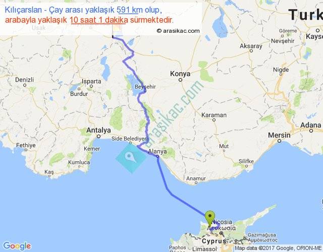 Kılıçarslan - Çay arası yaklaşık olarak 90 km/h ile yukarıda belirtilen sürede olup, iki yerin kuş uçuşu uzaklığı (mesafesi) 412'dir. Eğer belirtilen yerler arasında uçak seferi var ise bu süre uçakla 38 dakika'ya kadar düşebilir. Yolculuk otobüsle 13 saat 1 dakika sürmektedir.