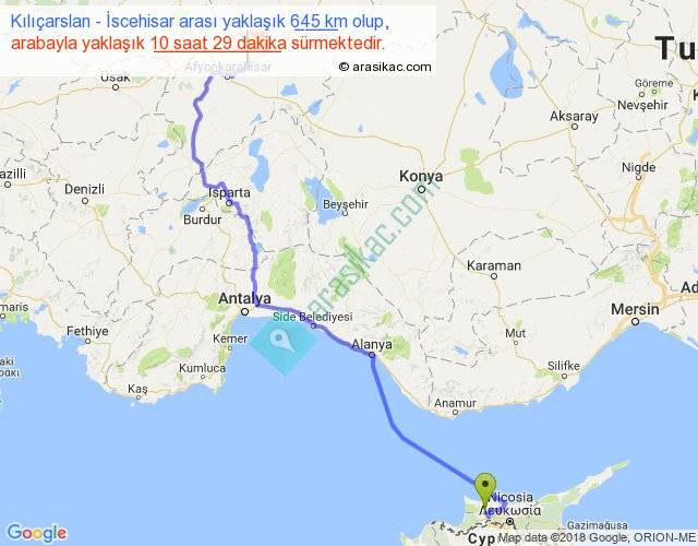 Kılıçarslan - İscehisar arası yaklaşık olarak 90 km/h ile yukarıda belirtilen sürede olup, iki yerin kuş uçuşu uzaklığı (mesafesi) 450'dir. Eğer belirtilen yerler arasında uçak seferi var ise bu süre uçakla 41 dakika'ya kadar düşebilir. Yolculuk otobüsle 13 saat 37 dakika sürmektedir.