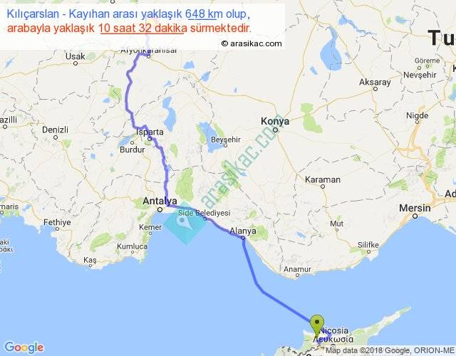 Kılıçarslan - Kayıhan arası yaklaşık olarak 90 km/h ile yukarıda belirtilen sürede olup, iki yerin kuş uçuşu uzaklığı (mesafesi) 474'dir. Eğer belirtilen yerler arasında uçak seferi var ise bu süre uçakla 43 dakika'ya kadar düşebilir. Yolculuk otobüsle 13 saat 41 dakika sürmektedir.