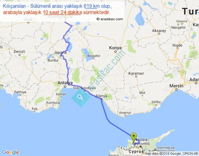 Kılıçarslan - Sülümenli arası yaklaşık olarak 90 km/h ile yukarıda belirtilen sürede olup, iki yerin kuş uçuşu uzaklığı (mesafesi) 437'dir. Eğer belirtilen yerler arasında uçak seferi var ise bu süre uçakla 40 dakika'ya kadar düşebilir. Yolculuk otobüsle 13 saat 31 dakika sürmektedir.