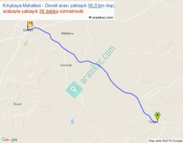 Kılıçkaya Mahallesi - Develi arası yaklaşık olarak 90 km/h ile yukarıda belirtilen sürede olup, iki yerin kuş uçuşu uzaklığı (mesafesi) 33'dir. Yolculuk otobüsle 36 dakika sürmektedir.
