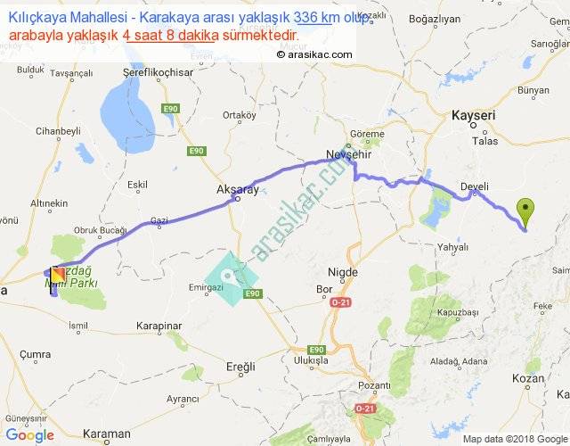 Kılıçkaya Mahallesi - Karakaya arası yaklaşık olarak 90 km/h ile yukarıda belirtilen sürede olup, iki yerin kuş uçuşu uzaklığı (mesafesi) 257'dir. Eğer belirtilen yerler arasında uçak seferi var ise bu süre uçakla 23 dakika'ya kadar düşebilir. Yolculuk otobüsle 5 saat 22 dakika sürmektedir.