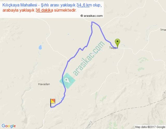 Kılıçkaya Mahallesi - Şıhlı arası yaklaşık olarak 90 km/h ile yukarıda belirtilen sürede olup, iki yerin kuş uçuşu uzaklığı (mesafesi) 20'dir. Yolculuk otobüsle 46 dakika sürmektedir.