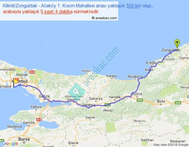 Kilimli Zonguldak - Ataköy 1. Kısım Mahallesi arası yaklaşık olarak 90 km/h ile yukarıda belirtilen sürede olup, iki yerin kuş uçuşu uzaklığı (mesafesi) 259'dir. Eğer belirtilen yerler arasında uçak seferi var ise bu süre uçakla 23 dakika'ya kadar düşebilir. Yolculuk otobüsle 6 saat 35 dakika sürmektedir.