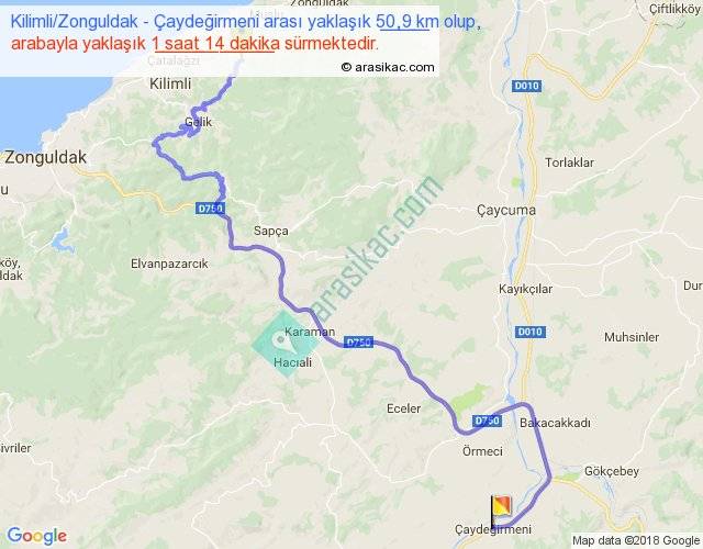 Kilimli Zonguldak - Çaydeğirmeni arası yaklaşık olarak 90 km/h ile yukarıda belirtilen sürede olup, iki yerin kuş uçuşu uzaklığı (mesafesi) 28'dir. Yolculuk otobüsle 1 saat 36 dakika sürmektedir.