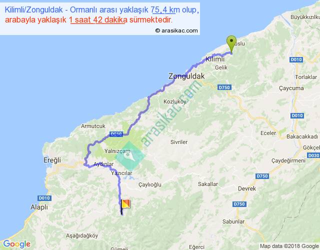 Kilimli Zonguldak - Ormanlı arası yaklaşık olarak 90 km/h ile yukarıda belirtilen sürede olup, iki yerin kuş uçuşu uzaklığı (mesafesi) 287'dir. Eğer belirtilen yerler arasında uçak seferi var ise bu süre uçakla 26 dakika'ya kadar düşebilir. Yolculuk otobüsle 7 saat 57 dakika sürmektedir.