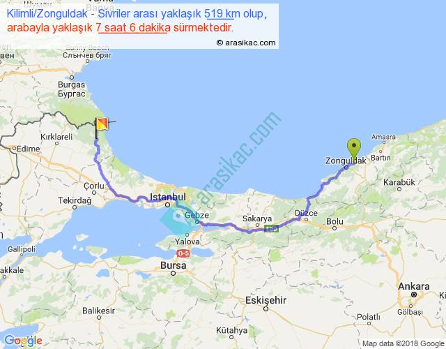 Kilimli Zonguldak - Sivriler arası yaklaşık olarak 90 km/h ile yukarıda belirtilen sürede olup, iki yerin kuş uçuşu uzaklığı (mesafesi) 336'dir. Eğer belirtilen yerler arasında uçak seferi var ise bu süre uçakla 31 dakika'ya kadar düşebilir. Yolculuk otobüsle 9 saat 13 dakika sürmektedir.