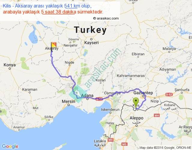 Kilis - Aksaray arası yaklaşık olarak 90 km/h ile yukarıda belirtilen sürede olup, iki yerin kuş uçuşu uzaklığı (mesafesi) 326'dir. Eğer belirtilen yerler arasında uçak seferi var ise bu süre uçakla 30 dakika'ya kadar düşebilir. Yolculuk otobüsle 7 saat 19 dakika sürmektedir.