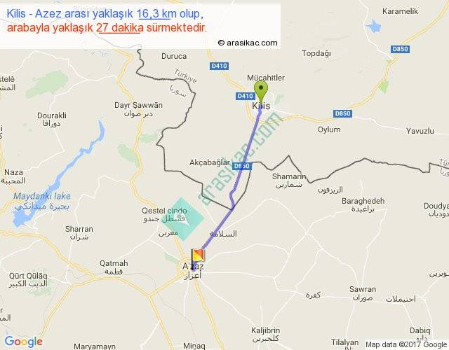 Kilis - Azez arası yaklaşık olarak 90 km/h ile yukarıda belirtilen sürede olup, iki yerin kuş uçuşu uzaklığı (mesafesi) 15'dir. Yolculuk otobüsle 35 dakika sürmektedir.