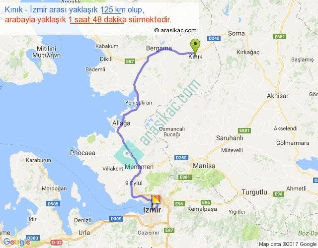 Kınık - İzmir arası yaklaşık olarak 90 km/h ile yukarıda belirtilen sürede olup, iki yerin kuş uçuşu uzaklığı (mesafesi) 76'dir. Yolculuk otobüsle 2 saat 20 dakika sürmektedir.