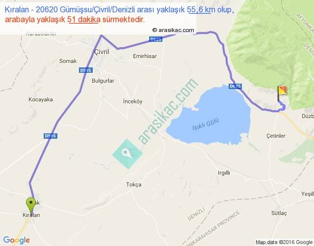 Kıralan - 20620 Gümüşsu Çivril Denizli arası yaklaşık olarak 90 km/h ile yukarıda belirtilen sürede olup, iki yerin kuş uçuşu uzaklığı (mesafesi) 33'dir. Yolculuk otobüsle 1 saat 6 dakika sürmektedir.