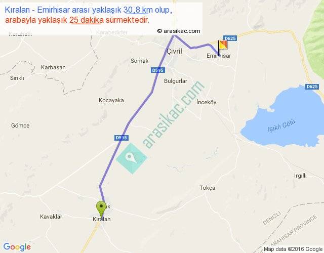 Kıralan - Emirhisar arası yaklaşık olarak 90 km/h ile yukarıda belirtilen sürede olup, iki yerin kuş uçuşu uzaklığı (mesafesi) 24'dir. Yolculuk otobüsle 32 dakika sürmektedir.