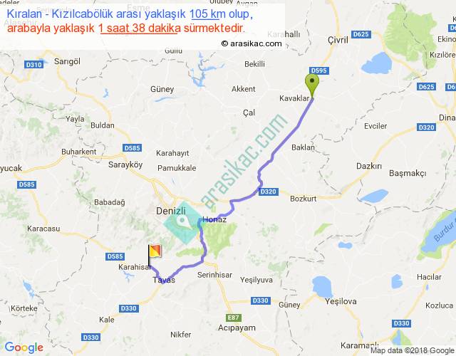 Kıralan - Kızılcabölük arası yaklaşık olarak 90 km/h ile yukarıda belirtilen sürede olup, iki yerin kuş uçuşu uzaklığı (mesafesi) 78'dir. Yolculuk otobüsle 2 saat 7 dakika sürmektedir.