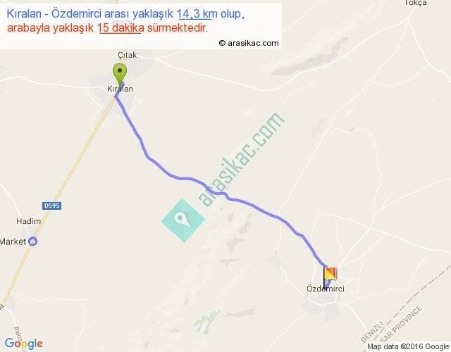 Kıralan - Özdemirci arası yaklaşık olarak 90 km/h ile yukarıda belirtilen sürede olup, iki yerin kuş uçuşu uzaklığı (mesafesi) 12'dir. Yolculuk otobüsle 19 dakika sürmektedir.