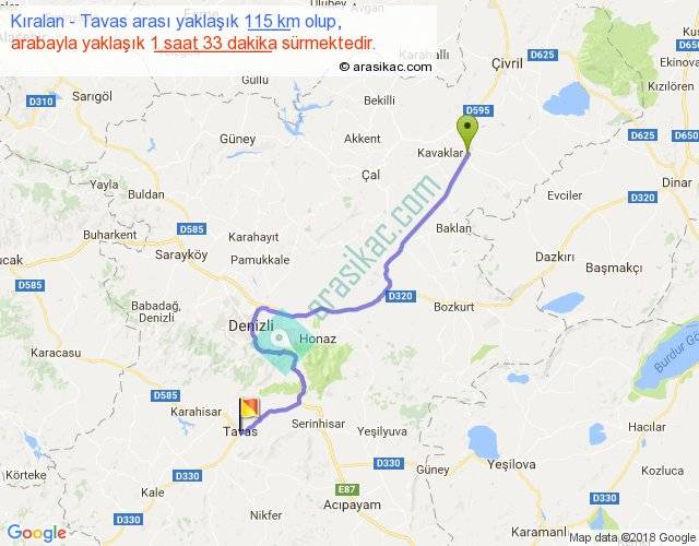 Kıralan - Tavas arası yaklaşık olarak 90 km/h ile yukarıda belirtilen sürede olup, iki yerin kuş uçuşu uzaklığı (mesafesi) 79'dir. Yolculuk otobüsle 2 saat 0 dakika sürmektedir.