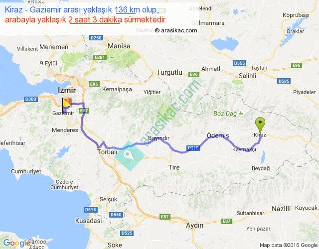 Kiraz - Gaziemir arası yaklaşık olarak 90 km/h ile yukarıda belirtilen sürede olup, iki yerin kuş uçuşu uzaklığı (mesafesi) 95'dir. Yolculuk otobüsle 2 saat 39 dakika sürmektedir.