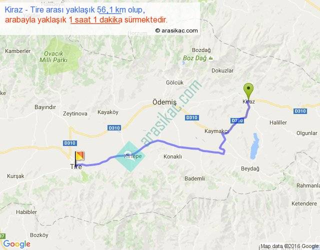 Kiraz - Tire arası yaklaşık olarak 90 km/h ile yukarıda belirtilen sürede olup, iki yerin kuş uçuşu uzaklığı (mesafesi) 44'dir. Yolculuk otobüsle 1 saat 19 dakika sürmektedir.