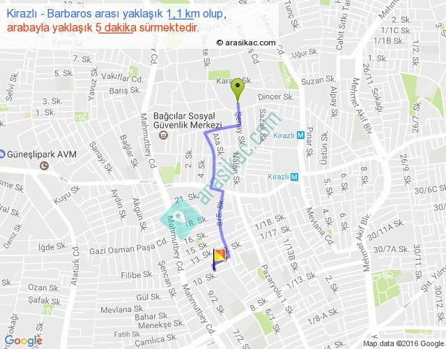 Kirazlı - Barbaros arası yaklaşık olarak 90 km/h ile yukarıda belirtilen sürede olup, iki yerin kuş uçuşu uzaklığı (mesafesi) 1'dir. Yolculuk otobüsle 6 dakika sürmektedir.