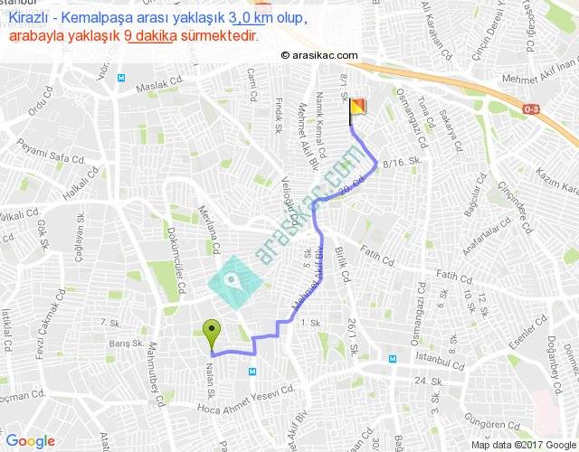 Kirazlı - Kemalpaşa arası yaklaşık olarak 90 km/h ile yukarıda belirtilen sürede olup, iki yerin kuş uçuşu uzaklığı (mesafesi) 2'dir. Yolculuk otobüsle 11 dakika sürmektedir.
