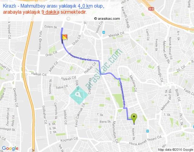 Kirazlı - Mahmutbey arası yaklaşık olarak 90 km/h ile yukarıda belirtilen sürede olup, iki yerin kuş uçuşu uzaklığı (mesafesi) 3'dir. Yolculuk otobüsle 11 dakika sürmektedir.
