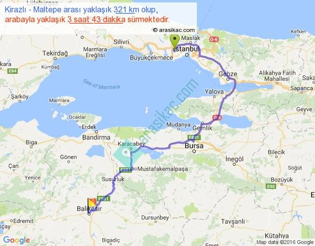 Kirazlı - Maltepe arası yaklaşık olarak 90 km/h ile yukarıda belirtilen sürede olup, iki yerin kuş uçuşu uzaklığı (mesafesi) 172'dir. Yolculuk otobüsle 4 saat 49 dakika sürmektedir.