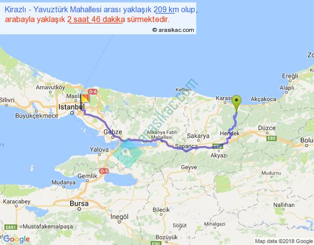 Kirazlı - Yavuztürk Mahallesi arası yaklaşık olarak 90 km/h ile yukarıda belirtilen sürede olup, iki yerin kuş uçuşu uzaklığı (mesafesi) 145'dir. Yolculuk otobüsle 3 saat 35 dakika sürmektedir.